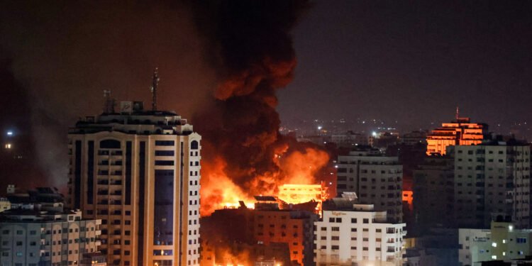A ball of fire and smoke rises during an Israeli airstrikes in the Gaza Strip, on October 9, 2023. Photo by Atia Mohammed/Flash90 *** Local Caption *** עזה רצועת עזה פלסטינים פיצוץ תקיפה אווירית חיל אויר אש מבצע חרבות ברזל חמאס